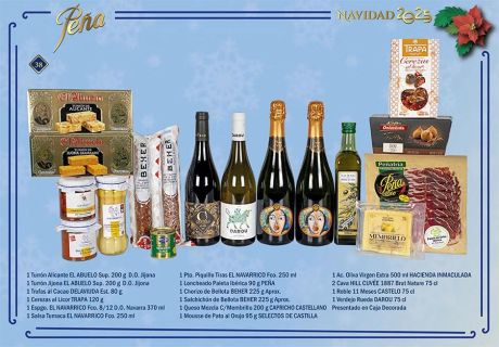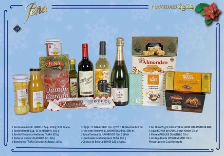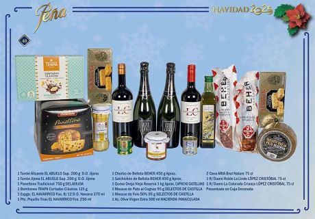 1 Jamón Serrano Gran Reserva PEÑA 7,50/8,00 kg. Aprox. 1 Chorizo de Bellota BEHER 450 g Aprox. 1 Salchichón de Bellota BEHER 450 g Aprox. 1 Tinto Roble YLLERA Nueve Meses 75 cl 1 Cava HILL CUVÉE 1887 Brut Nature 75 cl 1 Espgo. EL NAVARRICO Fco. 8/12 D.O. Navarra 370 ml 1 Pto. DE Piquillo Tiras EL NAVARRICO Fco. 250 ml 1 Queso Mezcla C/Membrillo 200 g CAPRICHO CASTELLANO 1 Mousse Pato Pta. Verde 95 g SELECTOS DE CASTILLA 1 Ac. Oliva Virgen Extra 500 ml HACIENDA INMACULADA 1 Turrón Duro Suprema EL ALMENDRO 150 g 1 Turrón Blando Suprema EL ALMENDRO 150 g 1 Bombones TRAPA Cortados Clásicos 115 g Presentado en Caja Decorada