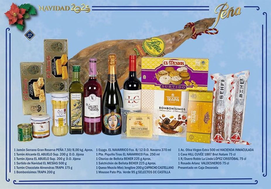 1 Jamón Serrano Gran Reserva PEÑA 7,50/8,00 kg. Aprox. 1 Turrón Alicante EL ABUELO Suprema 200 g D.O. Jijona 1 Turrón Jijona EL ABUELO Suprema 200 g D.O. Jijona 1 Surtido de Navidad EL MESÍAS 500 g 1 Turrón Chocolate Almendras TRAPA 175 g 1 Bombonísimos TRAPA 200 g 1 Espgo. EL NAVARRICO Fco. 8/12 D.O. Navarra 370 ml 1 Pto. De Piquillo Tiras EL NAVARRICO Fco. 250 ml 1 Chorizo de Bellota BEHER 225 g Aprox. 1 Salchichón de Bellota BEHER 225 g Aprox. 1 Queso Mezcla Miel/Jengibre 200 g CAPRICHO CASTELLANO 1 Mousse Pato Pta. Verde 95 g SELECTOS DE CASTILLA 1 Ac. Oliva Virgen Extra 500 ml HACIENDA INMACULADA 1 Cava HILL CUVÉE 1887 Brut Nature 75 cl 1 R/Duero Roble La Linde LÓPEZ CRISTÓBAL 75 cl 1 Rosado Arlanza VALDESNEROS 75 cl Presentado en Caja Decorada