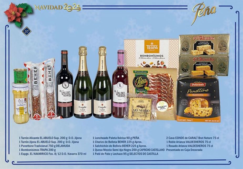 1 Turrón Alicante EL ABUELO Suprema 200 g D.O. Jijona 1 Turrón Jijona EL ABUELO Suprema 200 g D.O. Jijona 1 Panettone Tradicional 750 g DELAVIUDA 1 Bombonísimos TRAPA 200 g 1 Espgo. EL NAVARRICO Fco. 8/12 D.O. Navarra 370 ml 1 Loncheado Paleta Ibérica 90 g PEÑA 1 Chorizo de Bellota BEHER 225 g Aprox. 1 Salchichón de Bellota BEHER 225 g Aprox. 1 Queso Mezcla Semi Ajo Negro 200 g CAPRICHO CASTELLANO 1 Paté de Pato y Lechazo 95 g SELECTOS DE CASTILLA 2 Cava CONDE de CARALT Brut Nature 75 cl 1 Roble Arlanza VALDESNEROS 75 cl 1 Rosado Arlanza VALDESNEROS 75 cl Presentado en Caja Decorada