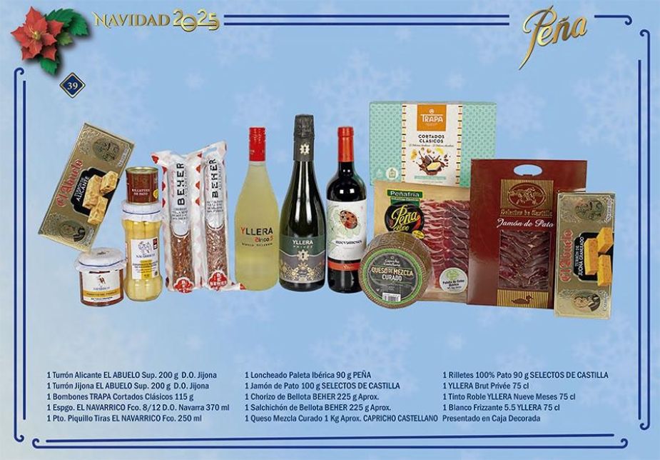 1 Turrón Alicante EL ABUELO Suprema 200 g D.O. Jijona 1 Turrón Jijona EL ABUELO Suprema 200 g D.O. Jijona 1 Bombones TRAPA Cortados Clásicos 115 g 1 Espgo. EL NAVARRICO Fco. 8/12 D.O. Navarra 370 ml 1 Pto. De Piquillo Tiras EL NAVARRICO Fco. 250 ml 1 Loncheado Paleta Ibérica 90 g PEÑA 1 Jamón de Pato 100 g SELECTOS DE CASTILLA 1 Chorizo de Bellota BEHER 225 g Aprox. 1 Salchichón de Bellota BEHER 225 g Aprox. 1 Queso Mezcla Curado 1 Kg Aprox. CAPRICHO CASTELLANO 1 Rilletes 100% Pato 90 g SELECTOS DE CASTILLA 1 YLLERA Brut Privée 75 cl 1 Tinto Roble YLLERA Nueve Meses 75 cl 1 Blanco Frizzante 5.5 YLLERA 75 cl Presentado en Caja Decorada